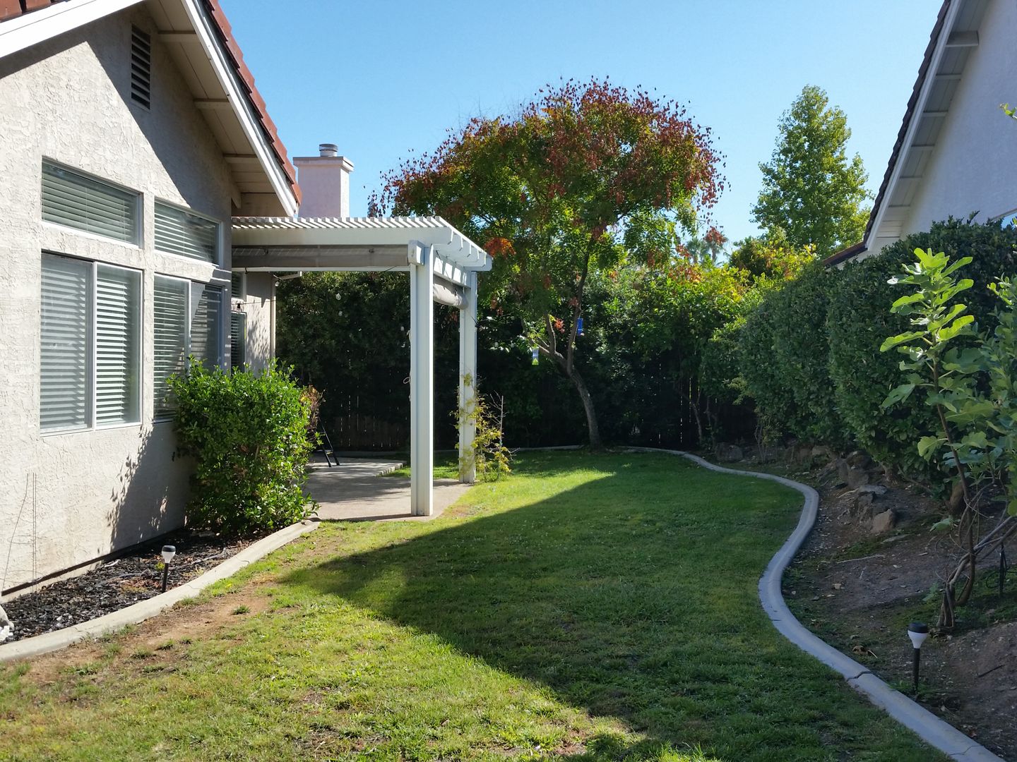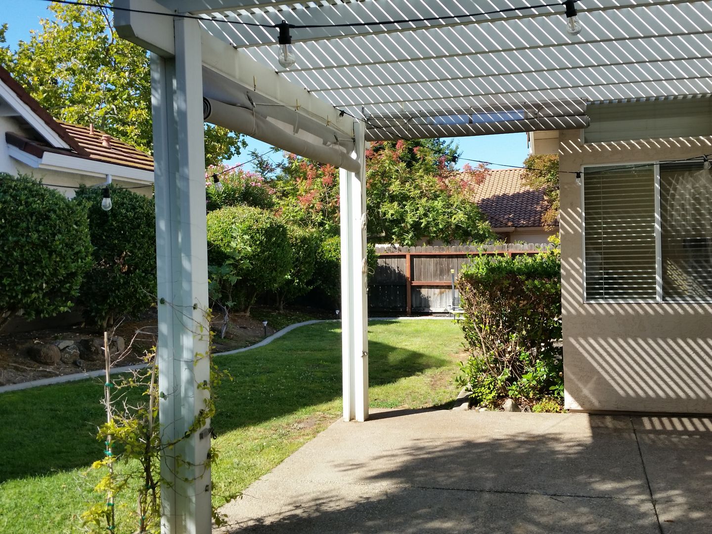 Beautiful backyard with a patio and awning—ideal for enjoying outdoor living and entertaining