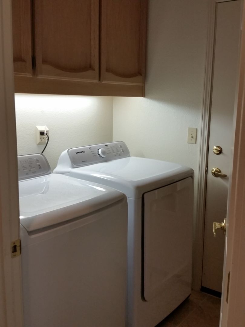 The kitchen comes equipped with a refrigerator, offering convenience for your grocery storage, and the included washer and dryer make laundry day simple and efficient.